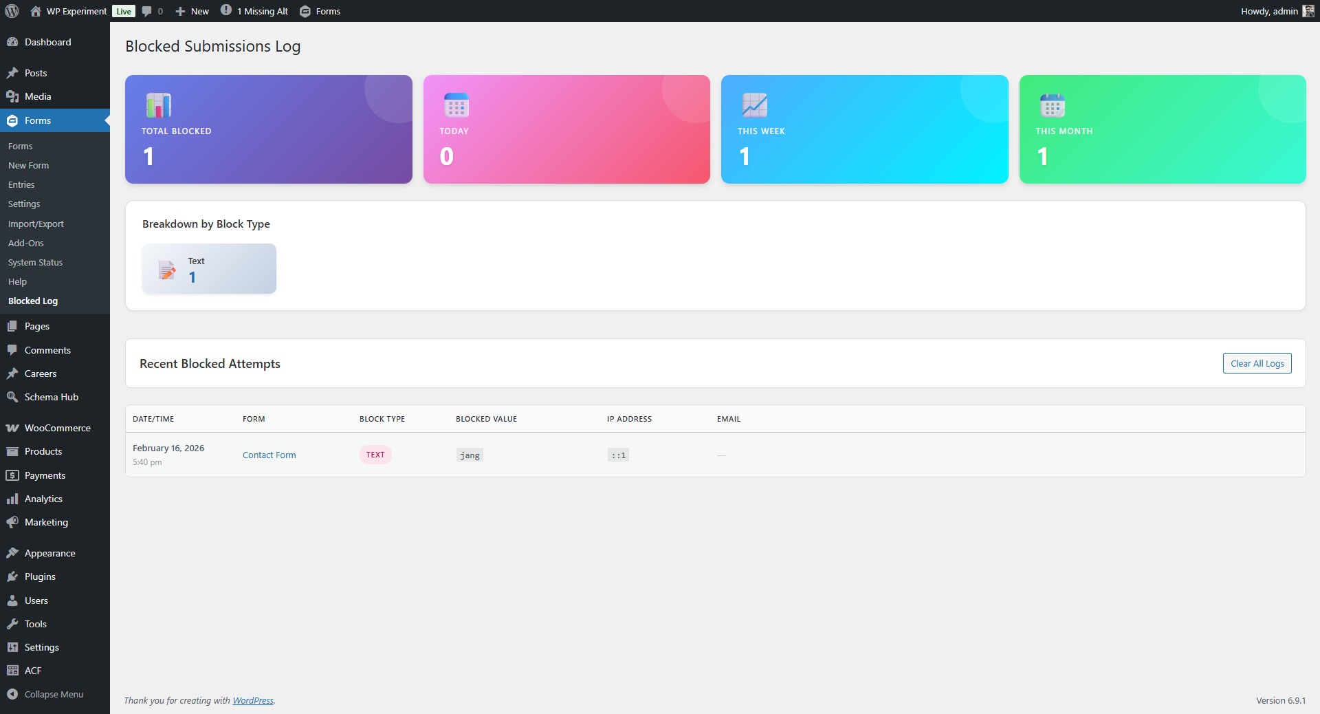 - View blocked submission logs at Forms Blocked Log.