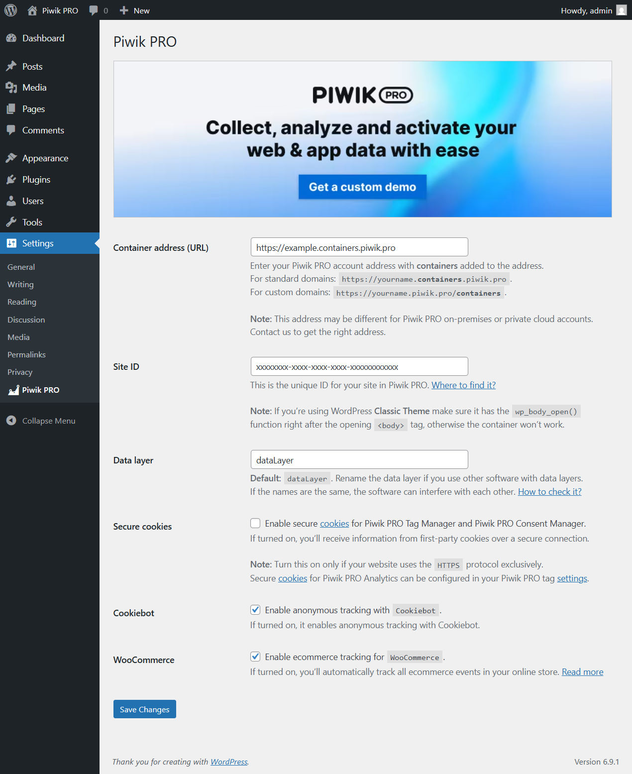 A simple plugin to add the Piwik PRO Analytics Suite container (with tracking code) to your WordPress site, making it easy to collect visitor data from any WordPress site and automatically track ecommerce in your WooCommerce store. You’ll also be able to manage consents and run tags after using this plugin.